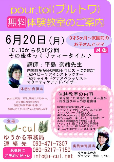 以前体験講座を開催させていただき、 ベビーリズムの講座が開講決定しました 現在5組のママとお子さんにご入会いただき、 楽しい教室となっています♪ pour.toi プルトワと読みます。 フランス語で「あなたのために」という意味です 無料体験教室 日時:6月20日(月) 10:30から約50分間 その後ゆっくりティータイム♪ 対象:0才5ヶ月〜就園前のお子さんとママ 講師:平島 奈緒先生 内閣府認証NPO国際セラピスト協会認定 TASベビーケアインストラクター TASチャイルドケアスペシ