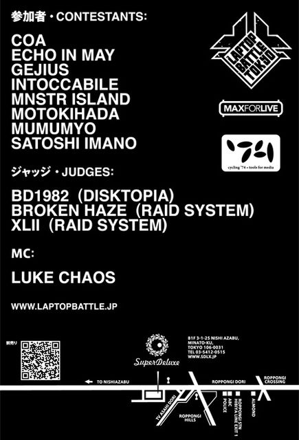 ラップトップ・バトルはラップトップ・ミュージシャン達による新種の真剣勝負。高速連打と絶妙なブレイクを操り、最終的に勝ち残った人…それは次世代のミュージシャン。どんなスタイルの音楽でもOK。