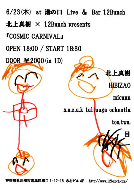 6/23(木) 北上真樹 × 12Bunch presents『COSMIC CARNIVAL』 at 溝の口12Bunch OPEN 18:00 / START 18:30 DOOR ¥2000(in 1D) ACT: 北上真樹 HIBIZAO micann s.u.z.u.k tultuuga ockestla 目 too,two, アクセス: 神奈川県川崎市高津区溝口1-12-18 志村ビル 4F(東急溝の口駅からポレポレ通りを直進→マルエツを左折→笑笑の入っているビルの4F。) 0448145250 http://www.12bunch.com/ この6組でステキな溝の口の夜を演出します! 是非ともおこしください!お待ちしてます!