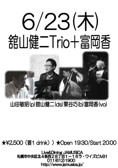 舘山健二Trio & 冨岡香vo. 山田敏昭p. 粟谷巧b. 20時〜2500円