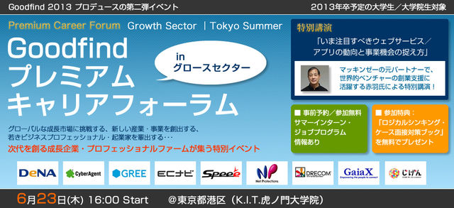 【まだ間に合います!2013卒向け・サマーインターンイベント】 ※大好評により増席しました! ≪Goodfind サマーインターンイベント in グロースセクター≫ http://www.goodfind.jp/2013/seminar/detail.html?sc_id=299 2011年6月23日(木) 16:00-20:30 DeNA、GREE、サイバーエージェント・・・成長産業・成長市場でグローバルに ビジネスを展開する、次世代のエクセレントカンパニーが一同に集結します。 例年、外資戦略コンサル・投資銀行・総合商社をはじめとした難関企業に 多数の内定者を輩出する、超ハイレベルなインターンシップに
