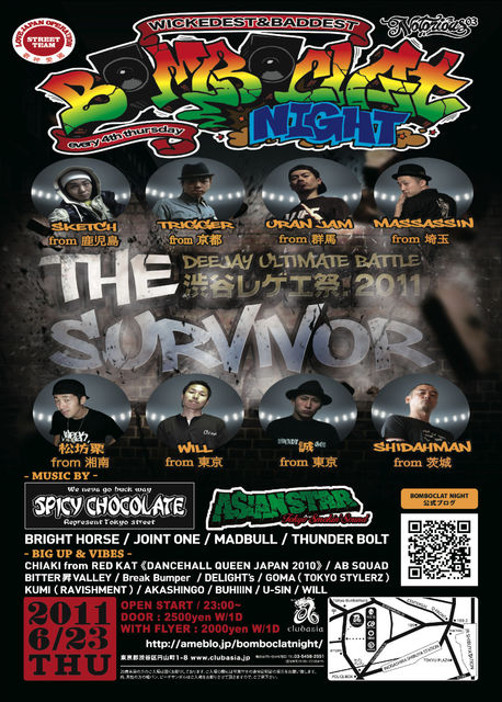 毎月第四木曜日の渋谷と言えば@clubasiaで【BOMBOCLAT NIGHT】 今回は東京を代表するレゲエサウンド“SPICY CHOCOLATE”が2009年に 立ち上げたビッグイベント”渋谷レゲエ祭2011”への出場権をかけたガチンコバトル! 【THE SURVIVOR to 渋谷レゲエ祭】”DEE JAY ULTIMATE BATTLE 2011”を開催!! 若手のARTISTによるDeeJay CLASHで一体何が起こるのか!? 東京、湘南、埼玉、茨城、奈良、群馬、鹿児島から 地元でブイブイいわしているDEE JAY達が熱いプライドを掛けて ぞくぞくと登場!! 歴史的ともなるこの瞬間を1秒たりとも見逃すな