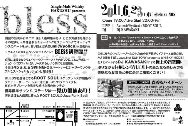 管理人様。告知お願いいたします。不適切な場合は削除してください。 ************************************************ Single Malt Whisky HAKUSHU presents BLESS 前回の出演から早二年、 優しく透明感があり、どこか力強さも感じるその歌声と 人間味溢れるチャーミングなステージングでオーディエンスのハートをがっちり掴んだ Azumi(Wyolica)が圧倒的なリクエストに答えるべくソロライブとしてBLESS初降臨!! 9月には様々なクリエイターやアーティストとのピアノによるコラボレーション・ソロアルバムをリリースするという気になる