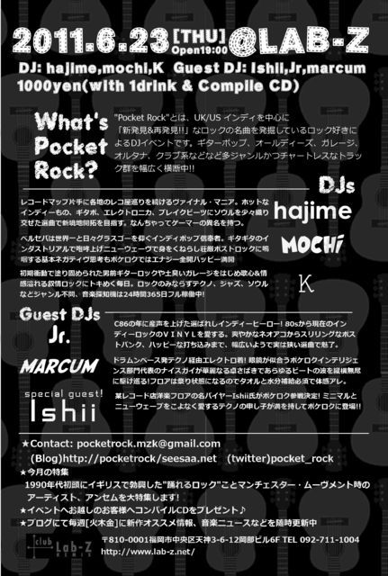 いつもお世話になってます。 ポケロクmochi子です。 (ポケロクとは…現代US/UKインディから'50 ROCKまで ロック愛を満タンに詰め込んだ福岡の音楽イベント) mixi:http://mixi.jp/view_community.pl?id=4910777 Blog:http://pocketrock.seesaa.net/ Twitter:http://twitter.com/#!/pocket_rock IVY IVY IVY!の皆様方、 先日のFishmansナイトお疲れ様でした。 あれから数日間ずっとフィッシュマンズ付けでした。 フィッシュマンズを聴いてると雨も心地よく思えます。 って、ここ告知の場所ですね。 今月のポケロク、遂に10回
