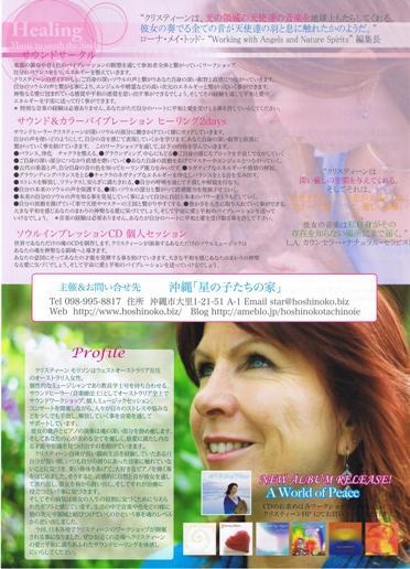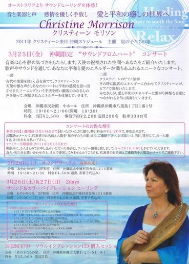 管理人さま&コミュのみなさま。 こんにちは。 沖縄の「星の子たちの家」Katsueです。 今日は、オーストラリア在住のクリスティーン モリソンのイベントのご案内をさせていただきます。 沖縄での開催になりますが、今からなら格安チケットなどもご利用になれます。 音楽とヒーリングに興味のある方に、是非ご案内下さい。 コンサートはチャリティコンサートとさせていただき、その収益は、被災地に寄付させていただきたいと想います。 ◆6月24日(金) サウンド フロム ザ ハート コンサート Sound from th