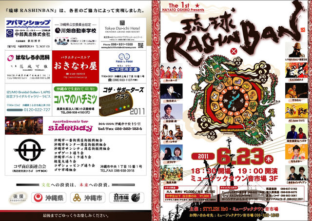 琉球RASHINBAN 日程:6月23日(木) 場所:コザ ミュージックタウン音市場 時間:18:30開場 19:00開 料金:一般3,000円(前売)/3,500円(当日) 中学生以下1,000円(当日) ※未就学児は無料 出演:ひげのかっちゃん/知名定人/KACHIMBA4/ネーネーズ/やちむん/仲宗根創/All Japan Goith/ザ・レキオ/国吉真宏&ハズキ/流星太鼓/なちぶさ〜/こきざみインディアン 問合:ミュージックタウン音市場 TEL:098-932-1949 http://okinawaloveweb.jp/event/event-information/3161.html オーガナイザー:大城隼人