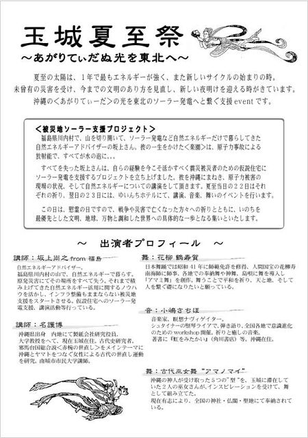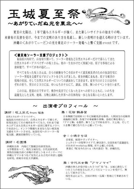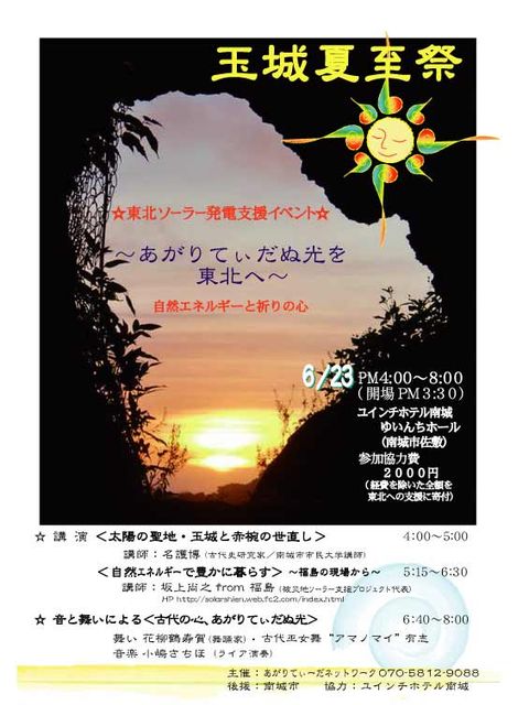 自然エネルギーについて、福島より太陽発電を普及させている方を招き、お話をうかがいます。 また、沖縄の考古学者によるかつての太陽信仰についてのお話。目からうろこかもしれませぬ。是非多くの方に聞いて欲しいです。そして応援してほしいと思います。 そして舞と音楽で、あがりてぃーだの光を東北へ繋げ、一日でも早い復興を祈ります。 〜〜〜〜以下 イベント企画内容です〜〜〜 太陽が、沖縄の始祖アマミコがつくったとされる玉城グスクの岩の門に入る夏至の日。 その朝日は、最もエネルギーが強く、また新しいサイクルの始まりでも