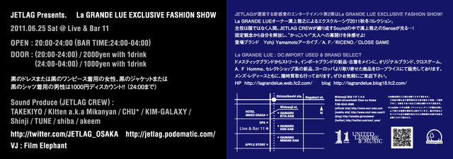 6月25日(土)に、20年以上に渡ってYohji YamamotoやCOMME des GARCONSをはじめとする様々なハイブランドのUSEDを取り扱うことで有名なセレクトショップのLa GRANDE LUEと、良質Prog.Tech.TranceパーティーのJETLAGが、心斎橋にあるオンジェムにて初となるEXCLUSIVE FASHION SHOWを行います!