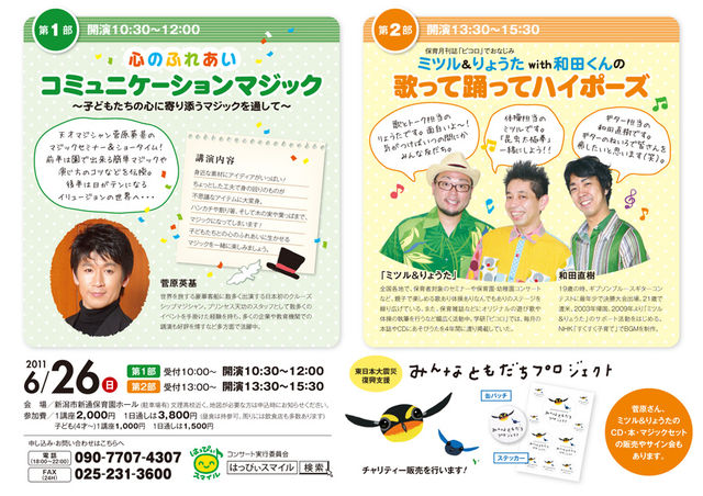 新潟のはっぴぃスマイルさんの企画 ミツル&りょうたwith和田直樹でお送りする ≪歌って≫≪踊って≫≪あそんで≫の2時間です こりゃ行かなくちゃ〜 そして午前は菅原英基さんによるマジックもあります 詳細は下記をご覧くださいね〜 ★・・・・・・・★・・・・・・・・★・・・・・・・★・・・・・・・★ 《午前の部》10:30〜12:00 菅原英基マジシャンによる 「マジックのセミナー&ショータイム」 ハンパなく素晴らしいですよ!