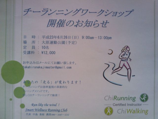 チーランニングワークショップを大原運動公園にて開催いたします。 今月末の6月26日(日)午前9時から午後1時までの約4時間。 ランニングビギナーさんからバリバリのランナーさんまで、 この機会にぜひ参加お待ちしております。 6月26日発売の「新潟こまち」さんにチーランニング情報が 掲載されます。 今後は長岡・新潟市での開催が多くなりますので、今のうちに! グルメマラソンが終わり、9月の浦佐山岳マラソンまでの間に じっくりと効率の良いフォームを身に付けよう! 日 時 : 平成23年6月26日 9:00am - 13:00pm 場