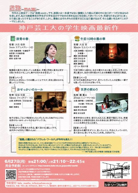 コミュニティのスペースをお借りしてしまい申し訳ありません! 管理人様、不都合がありましたら削除していただいてかまいません。 神戸芸術工科大学の映画専攻と シネ・リーブル神戸様とのコラボ企画 パラレルワールド2011 「迷路-MAZE-」を 今年も開催します!! 神戸で映画を学ぶ学生たちが作った中短編作品合計4作品を 一夜限りのレイトショーで上映致します。 入場無料! 神戸芸工大の学生映画をぜひ本物の映画館にてご鑑賞ください。 _________________________ 日時:2011年6月27日(