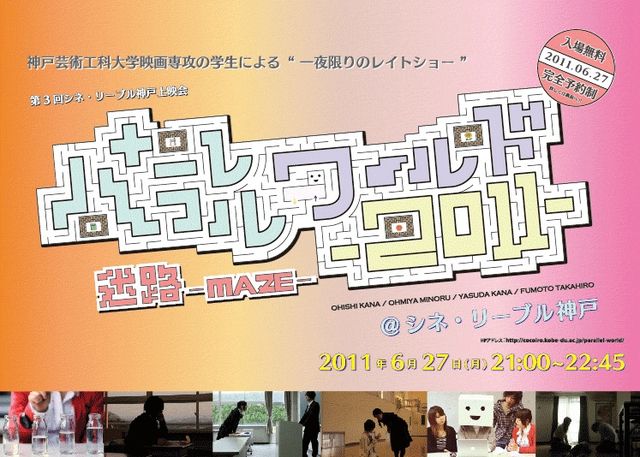 コミュニティのスペースをお借りいたします。 管理人様、不都合がありましたら削除していただいてかまいません。 【パラレルワールド2011映画上映会のお知らせ】 神戸芸術工科大学の映画専攻と シネ・リーブル神戸様とのコラボ企画 パラレルワールド2011 「迷路-MAZE-」を 今年も開催します!! 神戸で映画を学ぶ学生たちが作った中短編作品合計4作品を 一夜限りのレイトショーで上映致します。 入場無料! 神戸芸工大の学生映画をぜひ本物の映画館にてご鑑賞ください。 ______________________