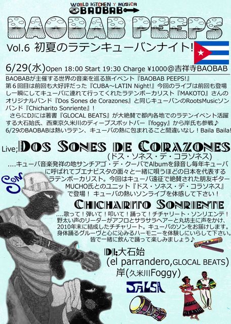 管理人様告知失礼します。 待ちに待ったバオバブラテンナイト第6弾! 誠さんのバンド『Dos Sones de Corazones』は本当に最高です! ブエナビスタのカチャイートに呼ばれてキューバで 毎年歌ってるなんて!! ギャバス! しかも\1000ではなかなかみれないですよん! DJも最高な大石始君とfoggyの岸さん! 水曜日はみんなラテンのリズムで踊りましょい♪ 6/29(水)Open 18:00 Start 19:30 Charge \1000 BAOBABが主催する世界の音楽を巡る旅イベント『BAOBAB PEEPS!』 第6回目は前回も大好評だった『CUBA〜LATIN