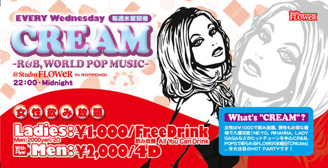 FLOWER毎週水曜日CREAMがついに始動! なんと女性は1000円で飲み放題、しかもゲストでご入場の女性にはシャンパンチケットをプレゼント! 男性もゲストでご入場のお客様は2000円/4dで入場可!もはやエントランスフリーです! MAIN FLOORはLADY GAGA,NE-YO,RIHANMAなどの大人気R&BTuneを中心に! 2ND FLOORはSouth Floorでお届け! タイトル通り甘いPARTYをお届けします。 メッセージいただければゲストでご招待いたします! また、メッセージが面倒だという方はエントランスで