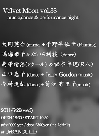 管理人さま、告知させて下さい 6.29(wed) Velvet Moon vol.33 music,dance & performance night! 大岡英介 Eisuke Oooka [music]+平野早依子 Sayoko Hirano+[Painting] http://www.myspace.com/oooka http://www.sayoko-hirano.com/ 鳴海姫子&たいち利枝(dance) 南澤靖浩(シタール)&福本卓道(尺八) 山口恵子(dance)+ Jerry Gordon http://3cmpress.blogspot.com/ 今村達紀(dance)+菊池 有里子[music] http://langchew.at.webry.info/ OPEN 18:30 / START 19:30 adv.2000 yen with 1drink / door