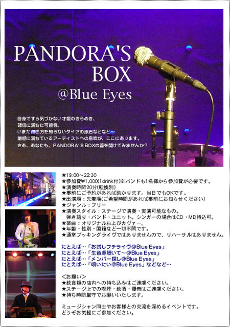 ●6月29日(水) PANDORA'S BOX(オープンマイク) open/start19:00(〜22:30) 参加費1名¥1000(1drink付) 演奏1組20分(転換別)※参加自由(予約可075-211-7698)