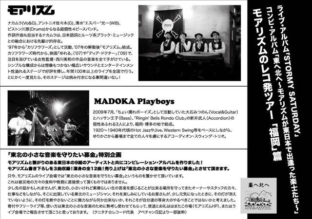 お待たせしました! 昨年の忘年会から半年!待望のモアリズム九州ツアー決定です! 対バンは、アントニオ佐々木が福岡で活動していた「ちょい濡れボーイズ」のメンバーである大石みつのんとハッサン王子が、アコーディオン奏者・新井武人と結成した「MADOKA Playboys」! MADOKA Playboysをまだ見た事無い方、必見! そして勿論ますますパワーアップしているモアリズムも必見! 会場でお会いしましょう☆ ********************** ライブ・アルバム「STORMY SATURDAY」& コンピ・アルバム「東へ北へ〜モアリズムが東日本で出逢っ