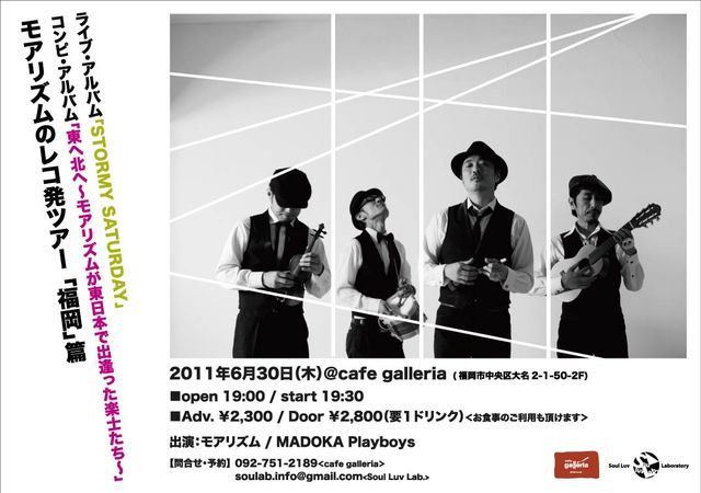 ちょい濡れボーイズファンの皆様に朗報! アントニオ佐々木が在籍する「モアリズム」 大石みつのん&ハッサン王子が在籍する「MADOKA Playboys」 やってそうでやってなかった待望の対バン決定! なんとしても遊びに来るしかございません! 管理人兼主催の私自身も非常に楽しみな夜です☆ 是非会場でお会いしましょう! ********************** ライブ・アルバム「STORMY SATURDAY」& コンピ・アルバム「東へ北へ〜モアリズムが東日本で出逢った楽士たち〜」 のレコ発ツアー 「福岡」篇 □2011年6月30日(木)@cafe galleria