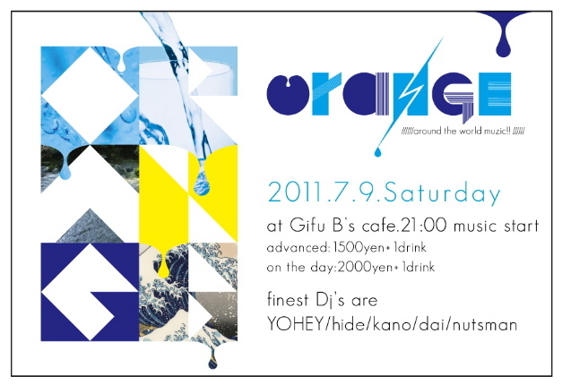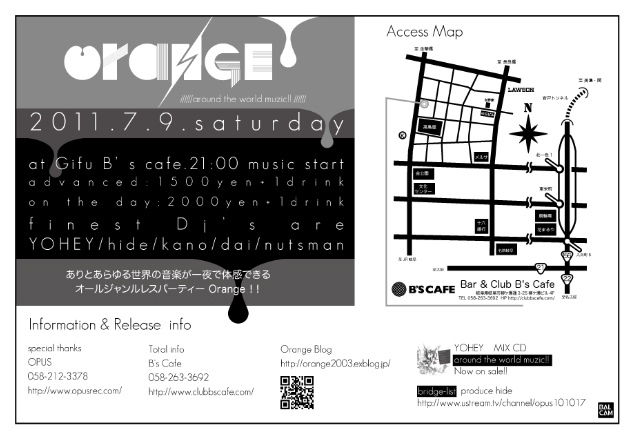 ◆Orange 2011.07.09(sat) @岐阜B's Cafe:058-263-3692 21:00 muzic start!!!! advanced:1500yen+1d on the day:2000yen+1d DJ's:YOHEY、hide、kano、dai、nutsman http://orange2003.exblog.jp/ special thanks:OPUS http://www.opusrec.com/index.html total info:B's Cafe 058-263-3692 http://clubbscafe.com/ ----------------------------- ※今年も上半期が終了ですね。 今年の5月で8周年を終えたOrange。 なんと今回の7月で開催回数99回目!!! 岐阜のクラブシーンを支えてきた!なんてことは思