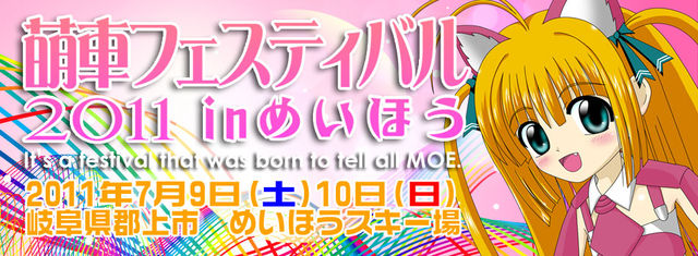 http://moefes.jp/ 萌車フェスティバル2011(東日本大震災チャリティーイベント) 開催日時:2011年7/9(土)・10(日) 開催場所:岐阜県郡上市 めいほうスキー場 ・痛車ドレスアップコンテスト(募集規模:1000台程度) ・参加者による人気投票 ・有名声優トークショー ・コスプレダンパ ・大抽選会 ・チャリティーオークション and more! ・一般見学者について 見学者の駐車料金は1台¥1000となります。 1駐車に対しての金額となりますので、再入場については再度お支払いいただく形になります。 ・オーディ