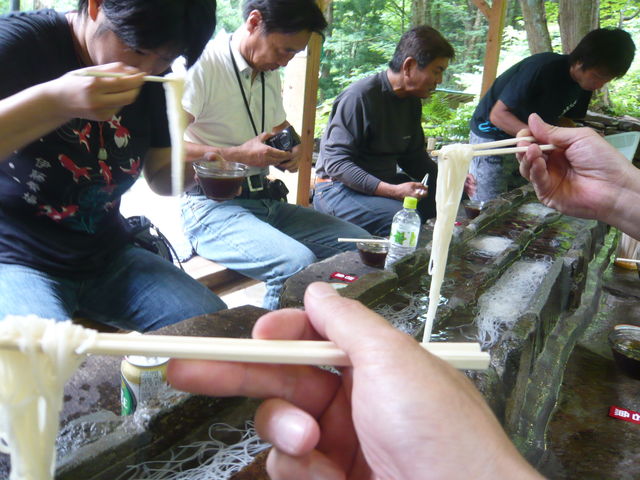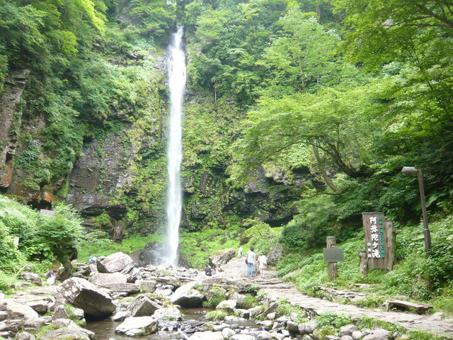 今年も流しそうめんツー、企画します! 阿弥陀が滝 垂直に切りだった崖が滝壺を囲む。 大量の水が閉ざされた空間に大量の飛沫を巻き上げる。 風向きが少し変わると飛沫を含んだ冷たい風を感じることができる。 舞い上がる水しぶきのため、夏は清涼感あふれる別天地となり、谷が東側に向かっているので、朝日を背にして滝の正面に立つと、水煙の中に自分 の影が映し出され、その影の回りがぼんやりと虹色に縁取られて見えることがあります。 冷水を流れる名物流しそうめんは絶品! 暑い夏は、やはり、ここしかない!
