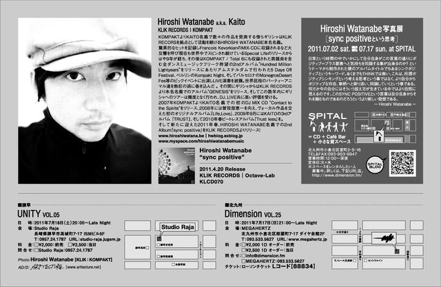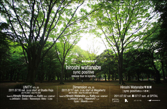 告知失礼します。 告知失礼します。 7月16日(土)UNITY VOL.5開催。HIROSHI WATANABE aka KAITO (KOMPAKT/KLIK RECORDS) Sync Positiveリリースツアー in 長崎。 ドイツの名門テクノレーベル"KOMPAKT"に所属する唯一の日本人クリエイターとして絶大な人気を誇る"KAITO"。他にも「QUADRA」「TREAD」など、さまざまな名義の活動でも世界中のファンから愛され、写真家としても独自のスタンスで活動を行っているマルチクリエーター「HIROSHI WATANABE」。本人名義では4年ぶりとなるアルバム「Sync Positive」がギリシャのKlik Recordsから、4/20に発