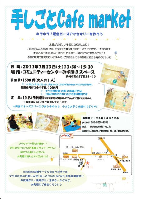 夏本番まであと少し!となったこの季節、夏色のビーズアクセサリーを手作りしてみませんか? 同室にキッズスペースを設けておりますので、小さなお子様連れでもOK! ティータイムには、冷たいドリンクとお茶菓子を楽しみながら、日頃の悩みや子育てのちょっと気になることなど、なんでもおしゃべりしちゃいましょう! お気軽にお問い合わせください♪ ――― 詳細 ――― 日時 :2011年7月23日(土)13:30〜15:30 場所 :コミュニティーセンターみずほBスペース 長崎市葉山2丁目2