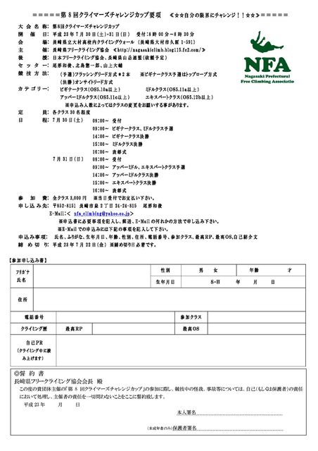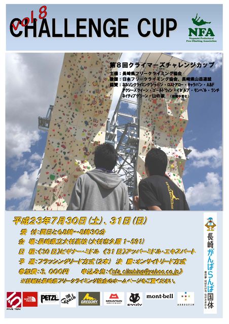 大会名称 : 第8回 クライマーズチャレンジカップ 開催日 : 平成23年 7月30日(土)・31日(日) 受付8:00〜8:30 会場 : 長崎県立大村高等学校内クライミングウォール (長崎県大村市久原1-591) 主催 : 長崎県フリークライミング協会 《http://nagasakiclimb.blog115.fc2.com/》 後援 : 日本フリークライミング協会、長崎県山岳連盟 (依頼予定) セッター : 尾形和俊、北島惣一郎、山上大輔 競技方法 : 予選:フラッシ