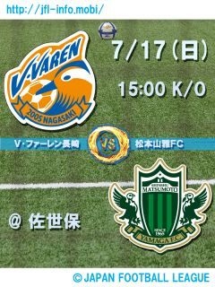 第13回 日本フットボールリーグ 後期 第3節 V・ファーレン長崎 vs. 松本山雅FC 2011年07月17日(日) 15:00 キックオフ 佐世保市総合グラウンド陸上競技場(長崎県佐世保市) http://www.city.sasebo.nagasaki.jp/www/contents/1118406792343/index.html < 前期第10節の結果 > vs. V・ファーレン長崎(H) 1△1 http://www.yamaga-fc.com/game2011/1304830816766.html [得点者] 塩沢 勝吾(45分)有光 亮太(74分) [観客数] 5,843人 ◇松本山雅FC http://www.yamaga-fc.com/ < 後期第2節の結果 > vs. 佐川印刷SC