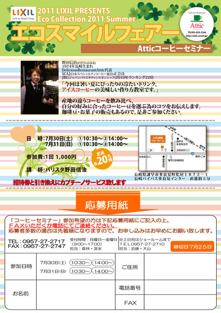 今年もやります INAXが社名変更し住宅の総合メーカーに生まれ変わりました その名も「LIXIL」 7月30日31日にスペシャルティコーヒーを使い フレンチプレスで飲む「コーヒーの飲み比べ教室」を行ないます アティックの自家製クッキーやスペシャルティコーヒーの販売も行ないます 応募用紙はAtticに用意しています。 参加希望の方は是非、返事くださいね。