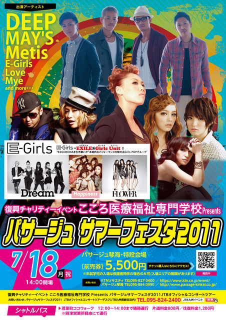 管理人様 告知失礼致します。 Metisが長崎夏の名物イベントパサージュサマーフェスタに出演決定 「復興チャリティーイベント こころ医療福祉専門学校Presents パサージュサマーフェスタ2011」 ・開催日時 2011年7月18日(月・祝) 開場14:00 ・開催場所 長崎県 パサージュ琴海特設会場 ・出演 DEEP、MAY'S、Metis、Love、E-girls(Dream・Happiness・FLOWER) and more(追加アーティスト随時発表) ・HP パサージュ琴海:http://www.passage-kinkai.co.jp/ KTNテレビ長崎:https://www.ktn.co.jp/event/