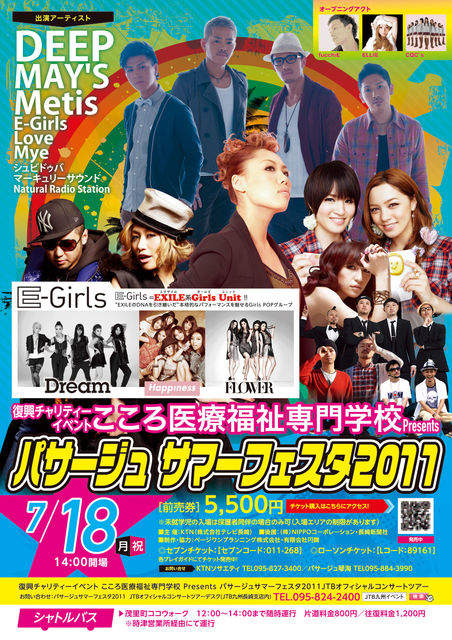 今年も去年に出演させて頂いた長崎夏の野外ビックフェスに出演決定いたしました ステージバックは全面海の最高のロケーション 九州の方も、そうでない方も1年で1番ハジけるELLIE見に来て下さい 「復興チャリティーイベント こころ医療福祉専門学校Presents パサージュサマーフェスタ2011 」 ・開催日時 2011年7月18日(月・祝) 開場14:00 ・開催場所 長崎県 パサージュ琴海特設会場 ・出演 DEEP、MAY'S、Metis 、Love、E-girls(Dream,Happines,FLOWER) ,Mye、ELLIE and more(随時追