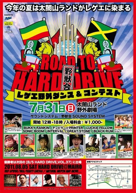 告知失礼します。 レゲエDJコンテスト&レゲエダンサーコンテスト 「ROAD TO HARD DRIVE」 【会場】 太閤山ランド野外劇場 富山県射水市黒河4774-6 ☎076-656-6116 【日時】7月31日(日) OPEN 12 : 00 〜 18:00 ※雨天決行(屋根があります) 【料金】1,000円 ●コンテスト出場者● 《Deejay部門》 REGSTA(福井) JUSTY WIDE(福井) 8-MAN(石川) SHIGEO(富山) KEYMA(富山) NICO-1(富山) 《ダンサー部門》 BANANA GYALZ(石川) CHERUBABY KID(石川) DUTTY STYLE(富山) キトキト★PUMPUM(富山) 司会