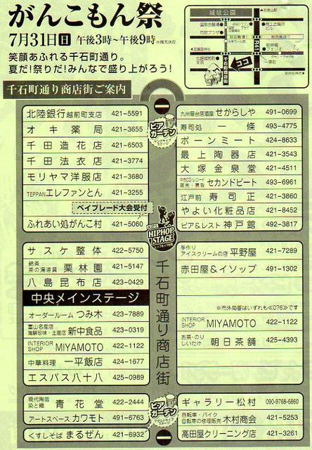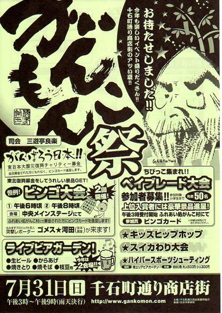 ■イベント名 がんこもん祭2011 http://www.gankomon.com/ ■日時 2011年7月31日(日)午後3時〜午後9時 ※雨天決行 ■場所 千石町通り商店街 富山県富山市一番町4−25 アクセス:JR富山駅前よりコミュニティバス 「まいどはや」中央ルート→「千石町通り商店街口」下車 ■主催 千石町通り商店街振興組合 ■後援 北日本新聞社 ■司会 三遊亭良楽 ■ゲスト ゴメス☆河田(吉本興業) http://profile.ameba.jp/gomez-kawata/ ※自分の出演は17:30〜18:30頃となります! (出演時間は30分程度) ※ステー