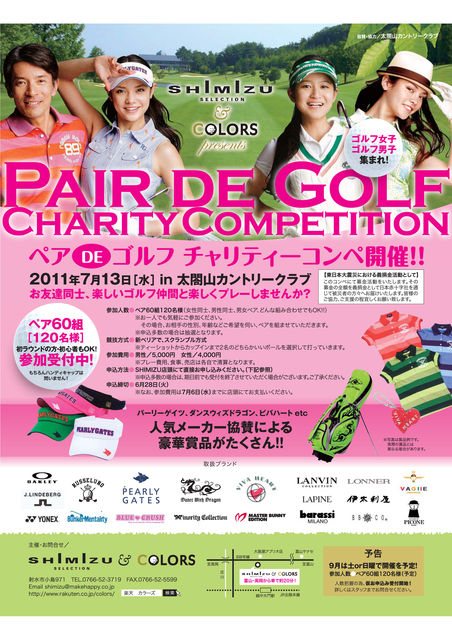 もう少し早く案内すればよかったのですがすみません マイミクさんに勧められて、ここで案内させていただくことにしました。 よろしくお願いします。 「ペアDEゴルフチャリティーコンペ」 ちょっと珍しいかもしれませんが、スクランブル形式のコンペです。 とにかく楽しくゴルフしましょ!ということで、去年から始めたのですが大好評だったので今年も開催することにしました スクランブルは、2名1チームでティーショットからカップインまで、どちらか良いボールを打っていく方法です。 なので、初心者からベテラ