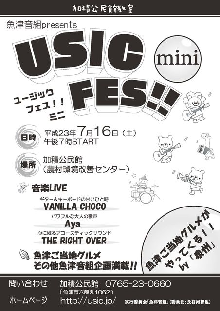 〜USIC FES!!mini〜 日時:7月16日(土)19時〜 会場:魚津市農村環境改善センター(加積公民館) 富山県魚津市六郎丸1062 Tel/0765-24-4440 音楽LIVE出演者(敬称略) VANILLA CHOCO Aya(パワフルな大人の歌声) THE RIGHT DVER(心に残るアコースティックサウンド) http://usic.jp/ ※久しぶりに魚津でのライブです
