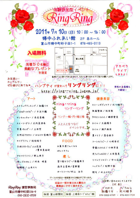 体験参加型イベント『RingRing』 (リング…輪・円・縁と縁 人と人をつなぐイベント) 日時 7月10日(日) 10:00〜16:00 場所 「婦中ふれあい館」 2階 各ホール 富山市婦中町砂子田1-1 076-465-3113 ◆入場無料 ◆先着50名様に素敵なプレゼントを進呈 【出店内容】 <アート> ●スクラップブッキング ●パステルアートセラピー ●サンキャッチャー ●スイーツデコ ●写真・カレンダー ●天然石アクセサリー ●カリグラフィ ●子供フラワーアレンジメント花育 ●アロ