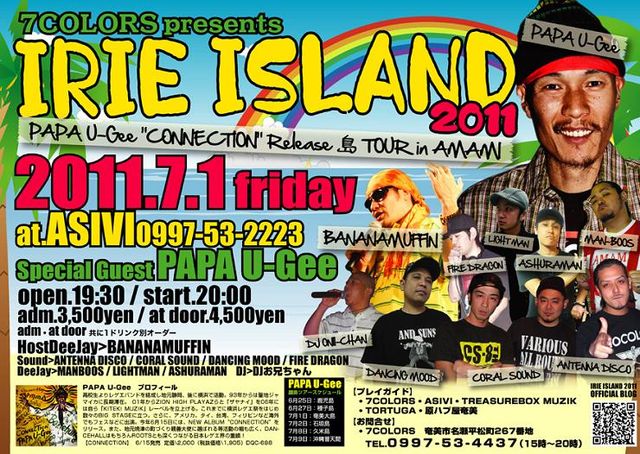 7COLORS presents IRIE ISLAND 2011 【期日】  2011年7月1日(金) 【場所】  ASIVI   奄美市名瀬金久町4-3 Tel 0997-53-2223 地図 【時間】  開場 19:30  開演 20:00 【料金】  前売 3,500円 (小学生以下は無料です)  当日 4,500円 (小学生以下は無料です)  ※18歳未満の方は、保護者同伴の場合に限り、ご入場いただけます  ※ご入場の際に ドリンクチケット(500円)をご購入いただきます 【SPECIAL GUEST】  PAPA U-Gee 【DeeJay】  BANANAMUFFIN  MANBOOS  LIGHTMAN