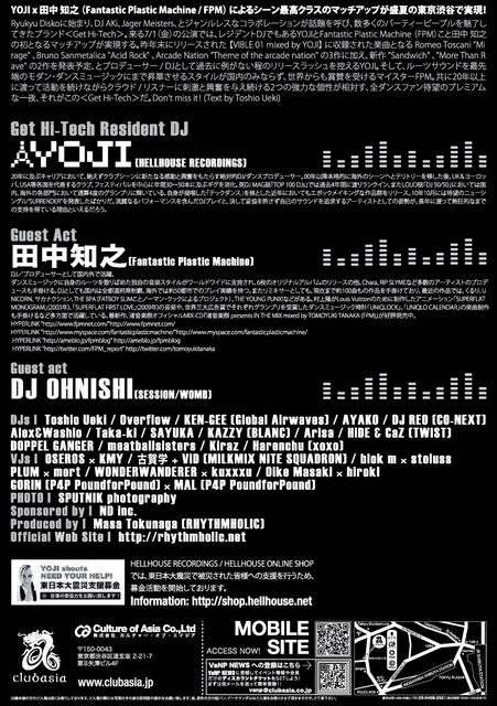 衝撃TWISTからHiDEと、CaZが出演することになりましたので、お知らせいたします!衝撃 危険・警告メッセージ等いただければ、ディスカウントで入場料\4000→\2500になりますので、お気軽にメッセージくださいムード ぴかぴか(新しい)YOJI x 田中 知之 (Fantastic Plastic Machine / FPM) によるシーン最高クラスのマッチアップが盛夏の東京渋谷で実現! ぴかぴか(新しい) 2011.07.01 (Fri) Get Hi-Tech New Generation Music of Lovers! Venue:渋谷club asisa Door:23:00 - 05:00 Entrance:\4,000- (1D) With Flyer\3,500(1D) Get