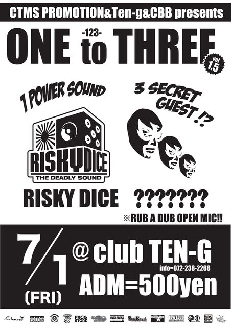 CBB RECORDS&CTMS PROMOTION&club TEN-G presents 7/1(金)@堺TEN-G 【ONE to THREE-123-vol 1.5】 ※当日限定!!!500円!!!!! <❶POWER SOUND> RISKY DICE <❸SECRET GUEST> ◯◯◯-◯from大阪 ◯◯from岐阜 ◯◯◯ ◯◯◯◯from大阪 and more...... <SUPPORT> KEIN fromWINCHESTER KENTO from WINCHESTER CTMS PROMOTION ※-123-を楽しむ心得 ❶時になったらテキーラ❶TUNEの間❶00円!!! ❷時になったらカクテル❷TUNEの間❷00円!!!!! &#