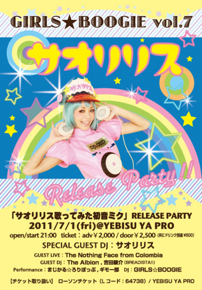 管理人様、告知失礼致します。 7月1日(金)、岡山にサオリリスが来てくださいます!! GIRLS★BOOGIE vol.7 『サオリリス 歌ってみた 初音ミク』RELEASE PARTY!! 2011/7/1(fri) @YEBISU_YA_PRO   open/start 21:00 チケット:adv¥2,000/door¥2,500(drink別) 【チケット取扱】ローソンチケット(Lコード:64738), YEBISU YA PRO ■SPECIAL GUEST DJ:サオリリス ■GUEST DJ: The Albion 吉田綾介(BREADISTA!!) ■GUEST LIVE: THE NOTHING FACE FROM COLOMBIA ■Performance まじかる★ろり