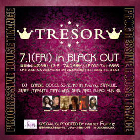 TRESOR(トレゾア) -supported by HAIR SET Funny- 2011/7/1(金) @BLACKOUT (福岡市中央区今泉1丁目13-5) OPEN⇒22:00 ジャンル PROGRESSIVE TRANCE PROGRESSIVE HOUSE etc.. ADV:¥2,000(1d付) DAY:¥2,500(1d付) ★軽食&BARBIEの手作りパンが食べれます(^^) -DJ- BARBIE (PROGRESSIVE TRANCE/HOUSE) GOCCI (PSYCHEDELIC/ELECTRO) SU−KE (EPIC TRANCE/HARD TRANCE) KEITA (HARDCORE/TECH) Asamy (HOU