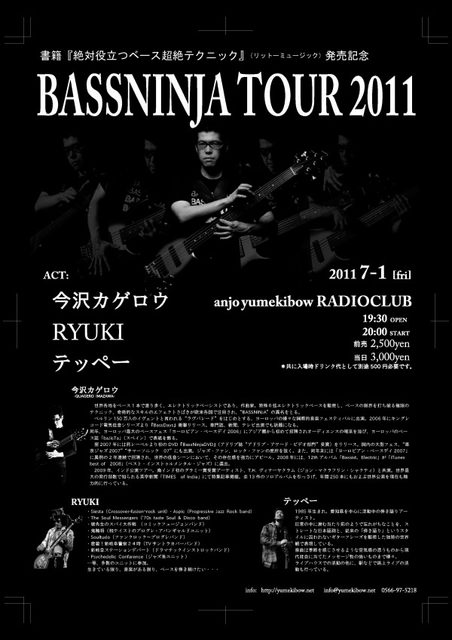 BASS NINJA出演決定!! 癒しのアコギ弾き語りテッペー、岐阜のスーパーベーシストRYUKIの3組ソロアーティストの出演となります。 書籍『絶対役立つベース超絶テクニック』(リットーミュージック)発売記念 BASS NINJA TOUR 2011  2011年7月1日(金) 愛知県安城市夢希望Radio Club http://www.yumekibow.net/ 開場 19:30 開演 20:00 前売り 2500円 当日 3000円(ドリンク代別途 500円) 出演 今沢カゲロウ http://www.bassninja.com/cgi-bin/top.cgi 今沢カゲロウ  プロフィール: 世界各地をベ