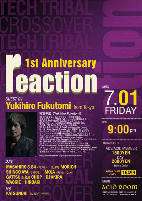 07/01 reaction ANNIVERSARY PARTY GUEST DJ 福富幸宏(Yukihiro Fukutomi) @ACID ROOM TECH,TRIBAL...CROSS OVER 皆様のお陰でreaction始めて、7月で早1年が経ちます。 その感謝を込めて、SPECIAL GUESTにJazz/House/Techno/Crossoverなどの日本音楽シーンに多大な影響を与え、シーンの発展に大きく貢献してきた鬼才福富幸宏(Yukihiro Fukutomi)氏が約3年振りにACID ROOM"reaction"に登場! 日本人のアーティストの中でもHOUSE MUSIC創成期から活動して、今も第一線で活躍するまさに大御所! 福富氏の覆面PROJECT"FOOG "や国内外のR