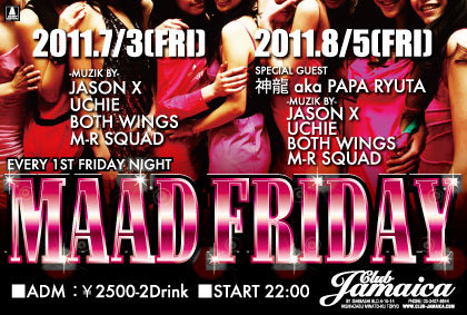 告知失礼します。 7/1(金) ☆MAAD FRIDAY☆ @西麻布CLUB JAMAICA -MUZIK BY- JASON X & UCHIE BOTH WINGS ≪http://mixi.jp/view_community.pl?id=3496966≫ M-R SQUAD ≪http://mixi.jp/view_community.pl?id=4795015≫ ADM:¥2500/2D OPEN: 22:00 ※先着15名に「MAAD FRIDAY MONTHLY MIX」プレゼント※ ADD: 港区西麻布4-16-14 石橋ビルB1F INFO: 03-3407-8844 毎月第1金曜日!老舗CLUB JAMAICAにて開催されているMAAD FRIDAY! 「BOTH WINGS」と「M-R SQUAD」をホストに、「CLUB JAMAICA CREW」も参加し、 フ