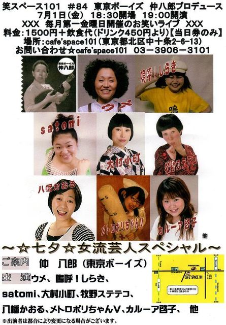 八幡かおる様ご出演のライブのご案内ですハート達(複数ハート) お時間ありましたら是非ぴかぴか(新しい)ご来場くださいませ!! 7/1(金)笑スペース101ライブ#84 東京ボーイズ仲八郎プロデュース 〜七夕☆女流芸人SP〜 cafe'space101(北区十条)にて http://www.geocities.jp/hyotandrum/space101/ 開場 18:30 開演 19:00 入場料☆1500円+飲食代(ドリンク450円より) 当日券のみ お問い合わせ☆cafe'space101 03―3906―3101 【出演】八幡かおる、ウメ、嗚呼!しらき、牧野ステテコ、satomi、大村小町、     メトロポリちゃ