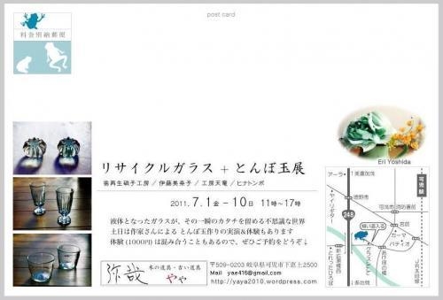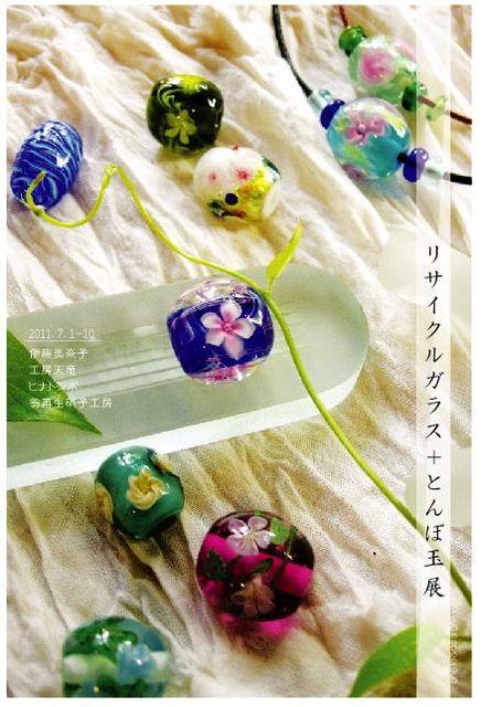 【 リ サ イ ク ル ガ ラ ス + と ん ぼ 玉+古道具 展 】 @築100年の古民家 2011.7/1(金)〜10(日)  11時〜17時(会期外時間外は御予約ください) ◆リサイクルガラス : 「翁再生硝子工房」さん ◆とんぼ玉 : 伊藤美奈子さん、工房天竜さん、ヒナトンボさん - – - 熱〜い液体が冷えて固まる一瞬のカタチ 不思議で多彩な、それぞれのガラスの世界をどうぞお楽しみに! ================== とんぼ玉づくり実演&体験のお知らせ ==========