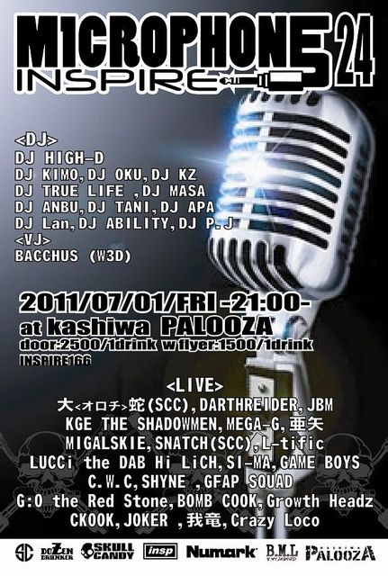 ■EVENT名 【MICROPHONE INSPIRE VOL.24】 ■場所 千葉県柏市柏 @ PALOOZA web→http://www.kashiwa-palooza.com/pc/index2.html ■OPEN 21:00 to Day Break ■PRICE ¥2,500 / 1D W/F \1,500 /1D ※深夜公演に付き(18歳未満入場不可) ※ENTRANCEにて、ID CHECKがございます。 ■MUSIC GENRE HIPHOP / R&B etc...♪ ■ACT (Flier参照) ---Dj High-D Biz--- http://djhigh-d.biz/
