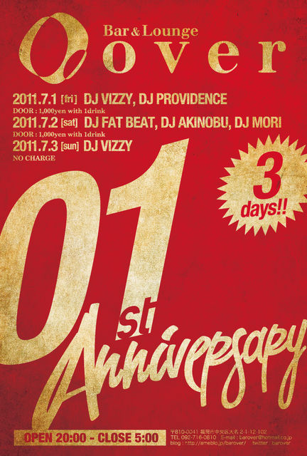 おかげ様で1周年が経ちましたぴかぴか(新しい) 多くの方に支えられた1年ぴかぴか(新しい) 新しい出会いもたくさん頂きましたるんるん 2年目も走り続けますので皆さん宜しくお願いします三日月 ■Bar&Lounge over 1st ANNIVERSARY PARTY!! 7/1 OPEN 20:00 CLOSED 05:00 DOOR 1000YEN with 1DRINK DJ VIZZY DJ PROVIDENCE 7/2 OPEN 20:00 CLOSED 05:00 DOOR 1000YEN with 1DRINK DJ MORI DJ AKINOBU 7/3 OPEN 20:00 CLOSED 05:00 NO CHARGE DJ VIZZY 皆さん3日間やりますのでご都合が良い日にご来店下さい!!