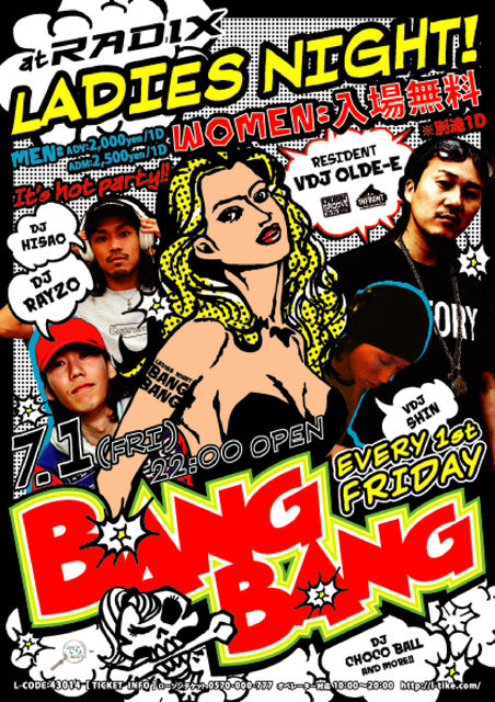 管理人様、告知失礼致します。 7.1(FRI) HIP HOP/R&B/TOP 40 22:00 OPEN 【Bang Bang-LADIES NIGHT-】 RESIDENT: VDJ OLDE-E DJs: VDJ SHIN DJ RAYZO DJ HISAO DJ CHOCO BALL and mo’ WOMEN: 入場無料※別途1D必要 MEN: ADV:2,000yen/1D ADM:2,500yen/1D Lコード:43014 TICKET INFO:ローソンチケット(0570-000-777[オペレーター対応:10:00〜20:00]、 http=//l-tike.com/) RADIX 052-332-0073